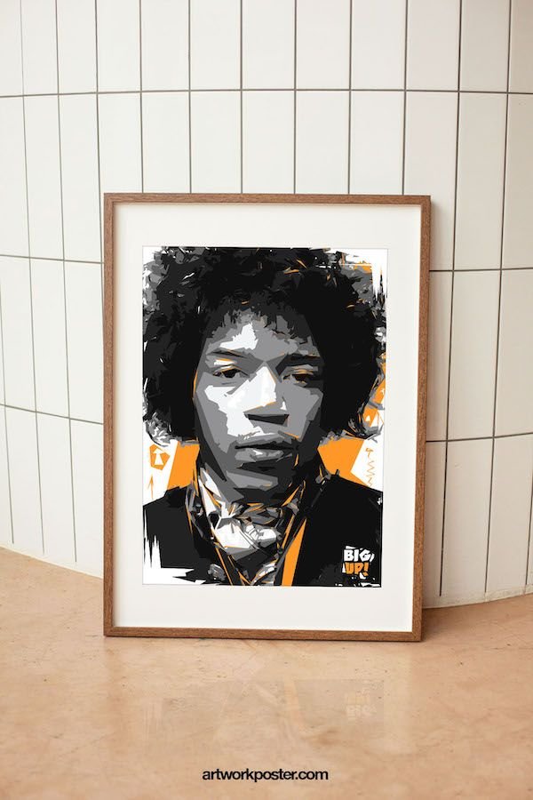 Abstract illustration of US-American Guitarist, composer and singer Jimi Hendrix. He was one of the most important and influential guitarists in the world because of his experimental and innovative playing style on the rock electric guitar. He had a lasting effect on the development of rock music. Handmade, numbered, signed and limited art poster by BIGUP OFFICIAL. Perfect combinable with other motifs of the Rockstars series.